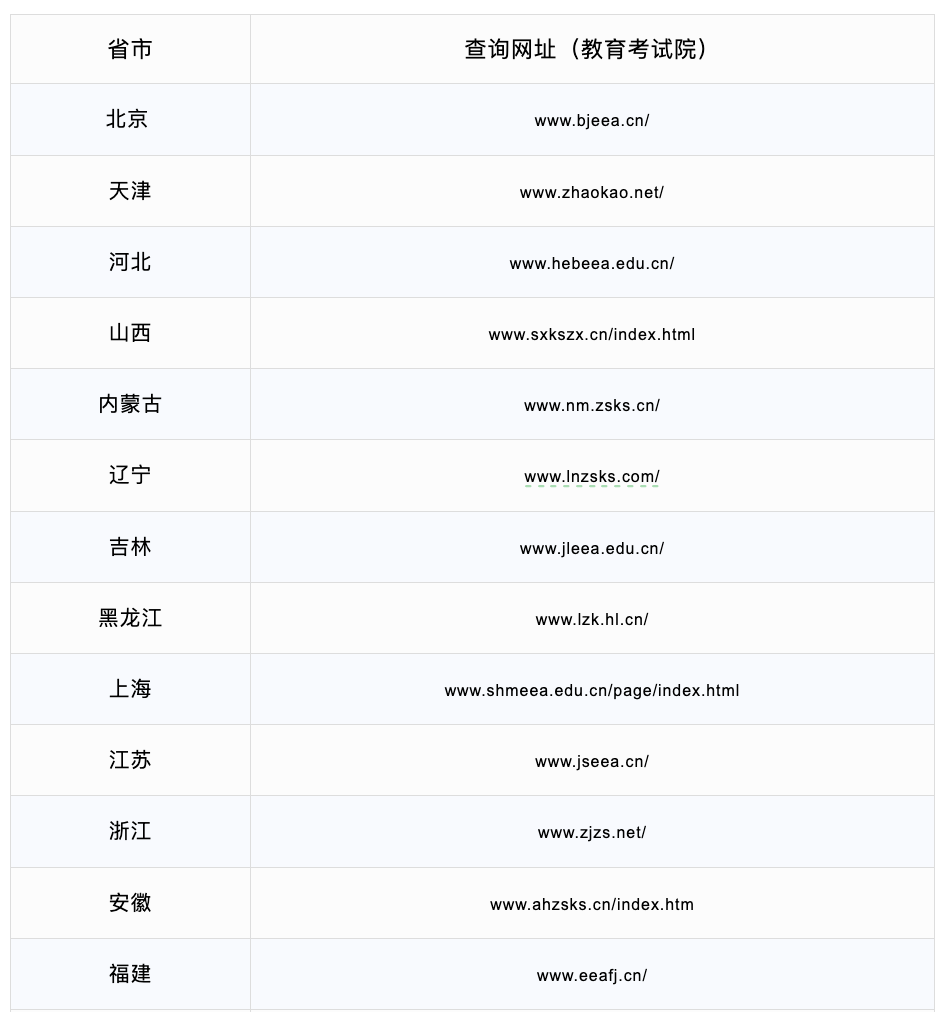 网站名一般为 XX 省考试院或招生信息网,不同地区叫法不同,只需要输入准考证号和身份证号就可以查询到。