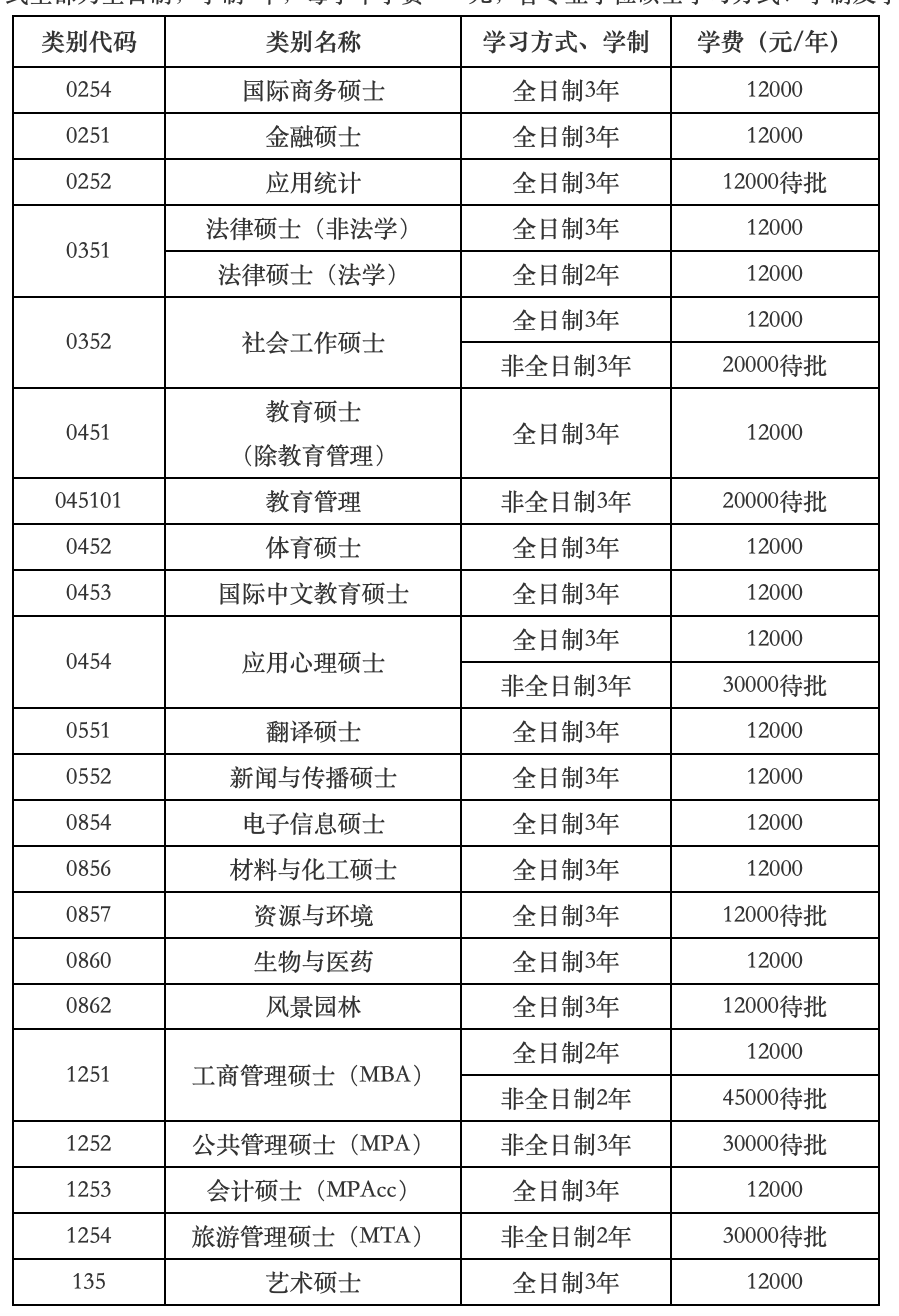 学术学位硕士学习方式全部为全日制,学制3年,每学年学费8000元;各专业学位硕士学习方式、学制及学费见下表: