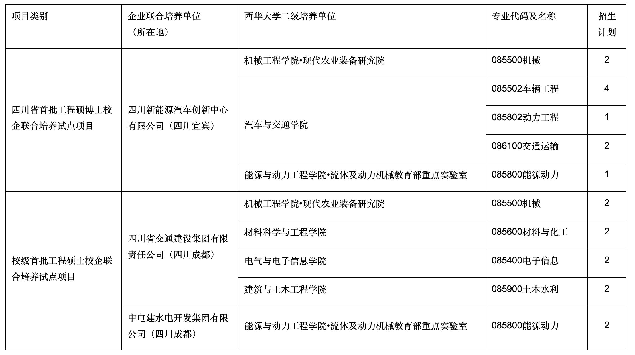 为贯彻落实 总书记关于“培养大批卓越工程师”的重要指示精神,学校启动“卓越工程师培养综合改革”试点工作,瞄准重大工程产业对高层次人才迫切需求的关键点,精准匹配优势培养单位和优势学科,联合领军企业,采取工学交替模式,就机械(车辆工程)、能源动力(动力工程)、交通运输、材料与化工、电子信息、土木水利六个专业面向产业需求,与国内龙头企业深度合作,开展专业学位研究生培养。所有计划学习方式为全日制,学制3年,一年级在西华大学完成课程学习,剩余时间依托联合培养单位研发项目在校企导师共同指导下完成工程实践和学位论文。具体招生专业及计划见下表。