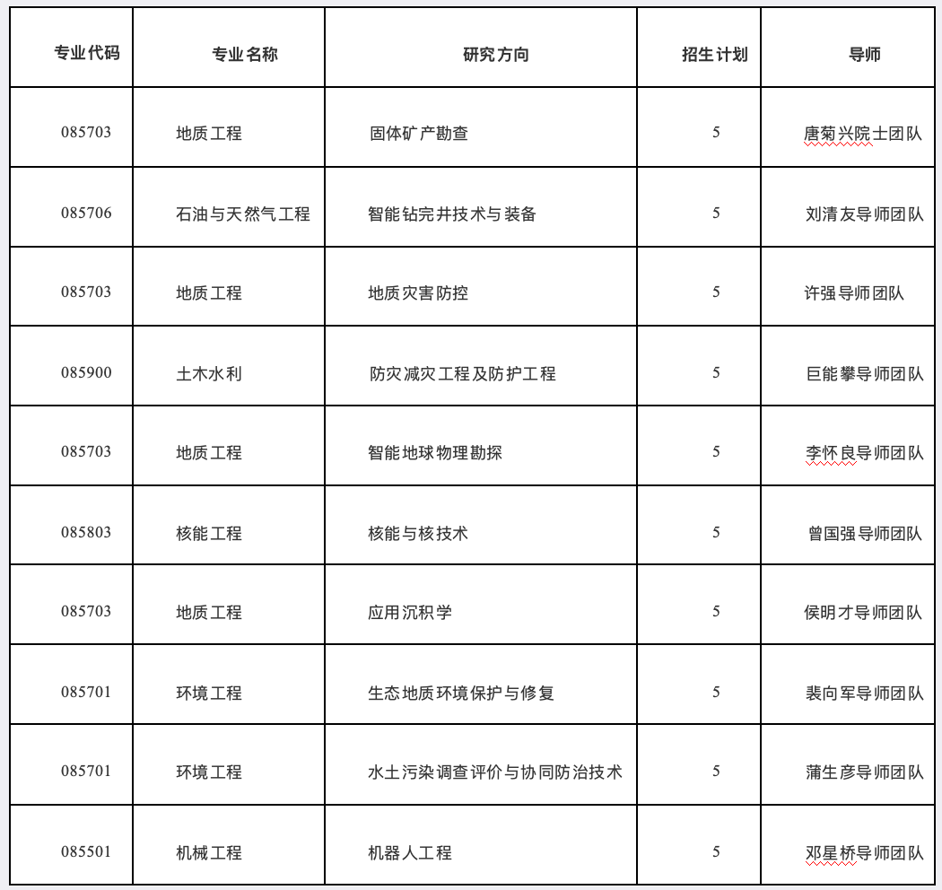 我校在以下专业招收“退役⼤学⽣⼠兵”专项计划的硕⼠研究⽣:085704测绘⼯程,085900⼟⽊⽔利(仅限环境与⼟⽊⼯程学 院招⽣),085402通信⼯程,125601⼯程管理,030500马克思主义理论,025400国际商务,070800地球物理学,085703地质⼯程 (仅限地球物理学院和能源学院招⽣),082700核科学与技术,085404计算机技术,035101法律(⾮法学),085701环境⼯程。