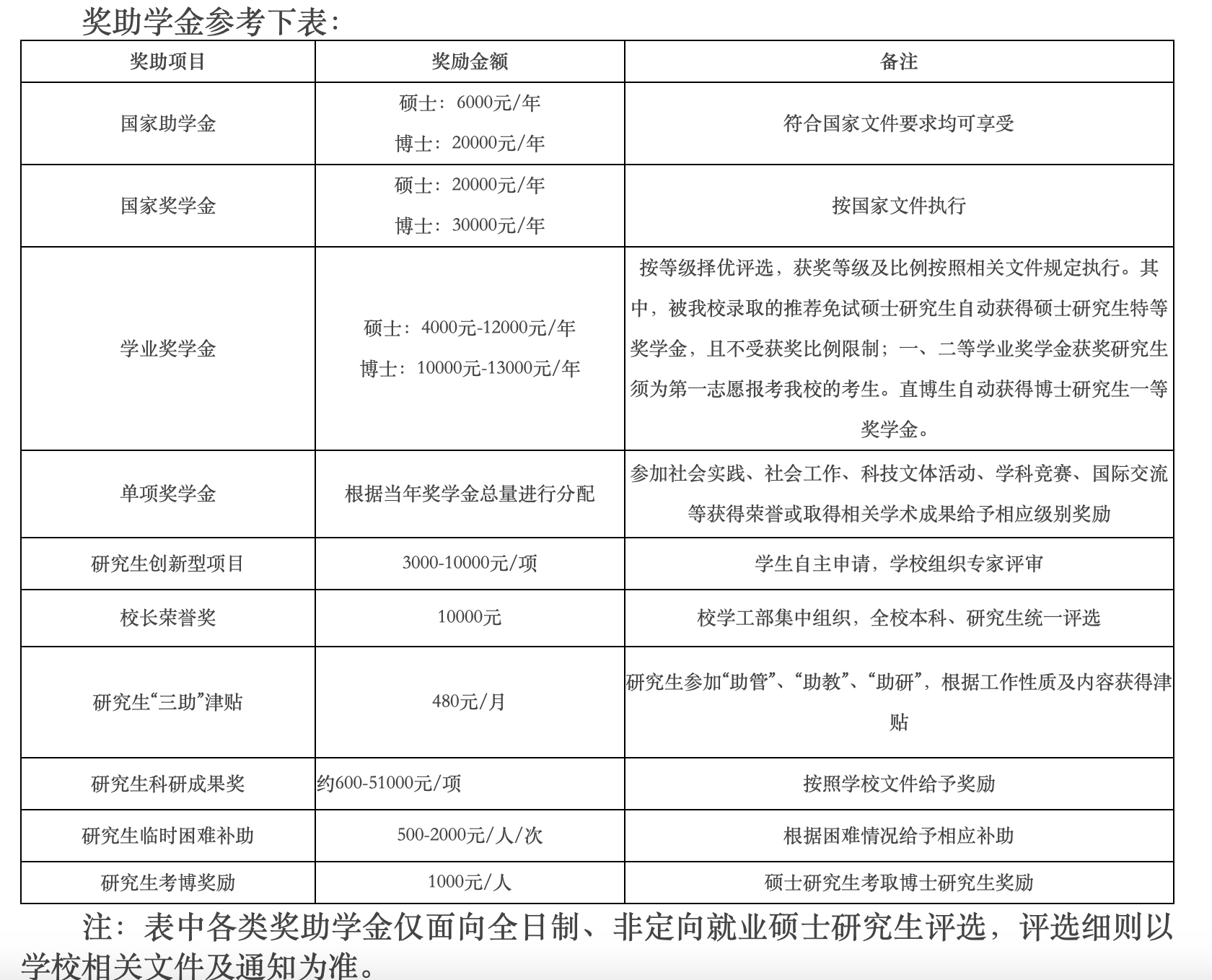 奖助学金参考下表: