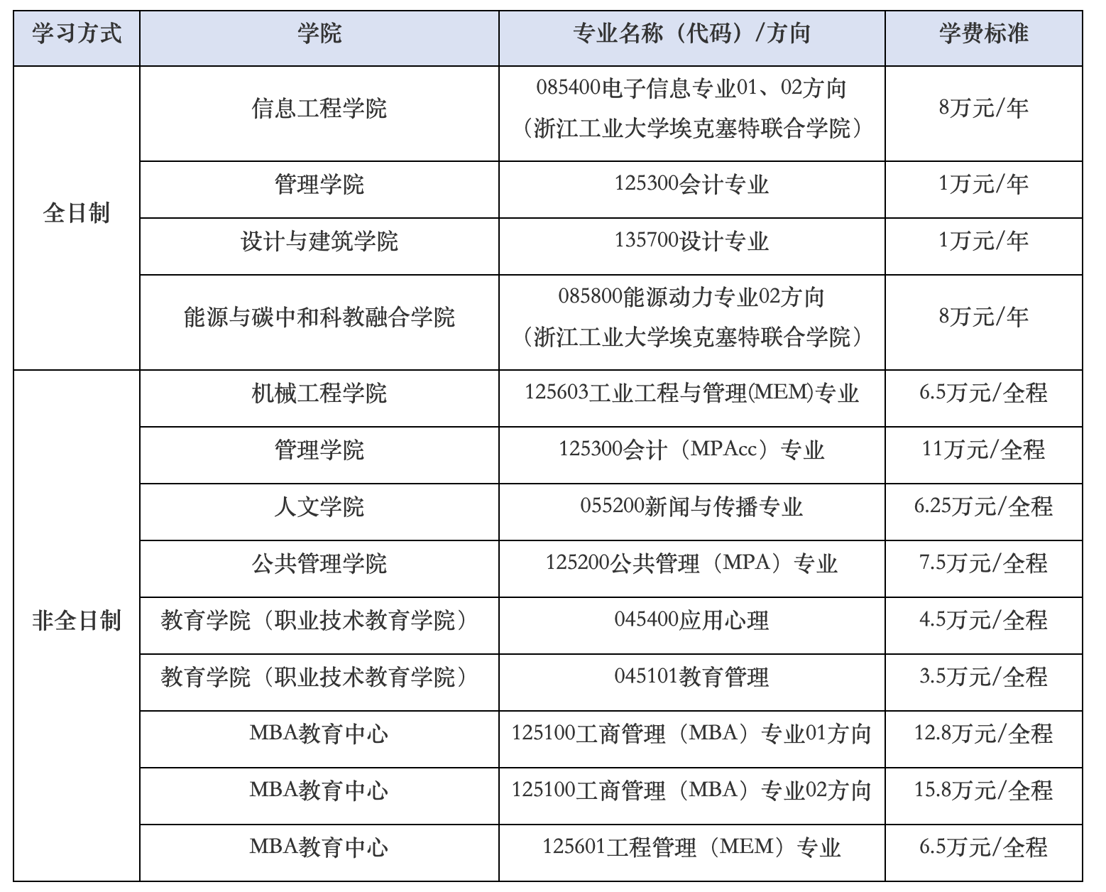 按照国家政策,我校招收全日制硕士研究生的专业,学费一般为8000元/年;非全日制研究生的专业,学费一般为2.5万元(全程)。除上述一般标准外,下列各专业学费按以下规定执行【各专业(方向)学费最终以物价部门审批为准】:
