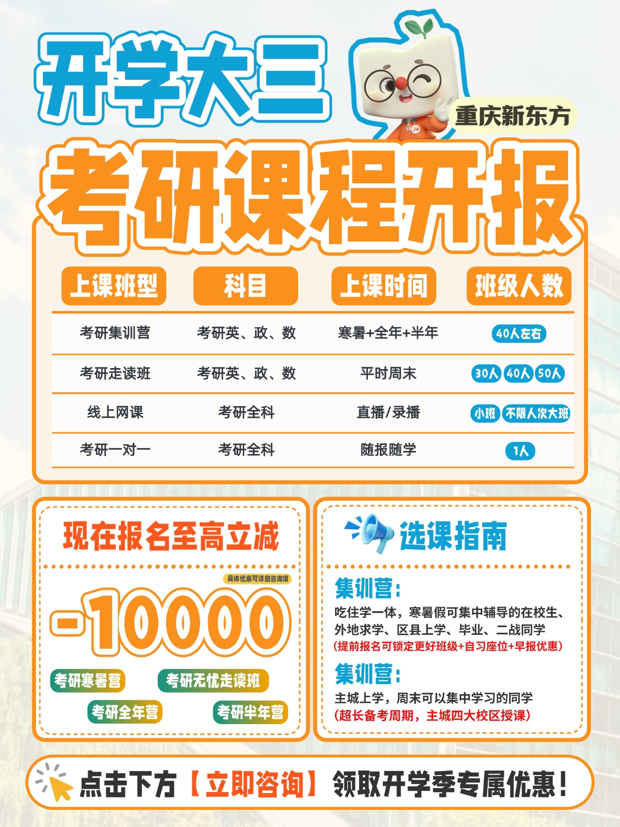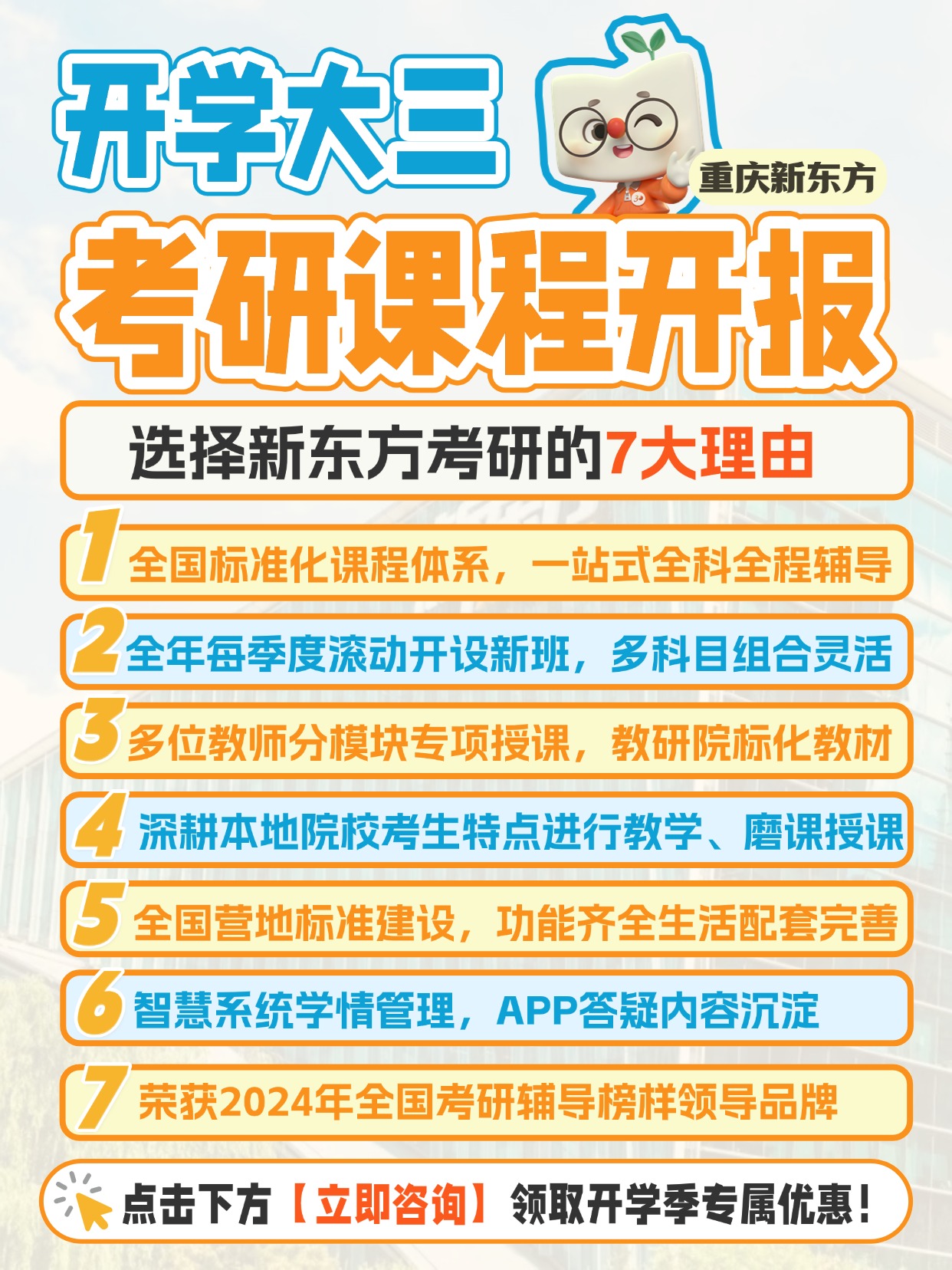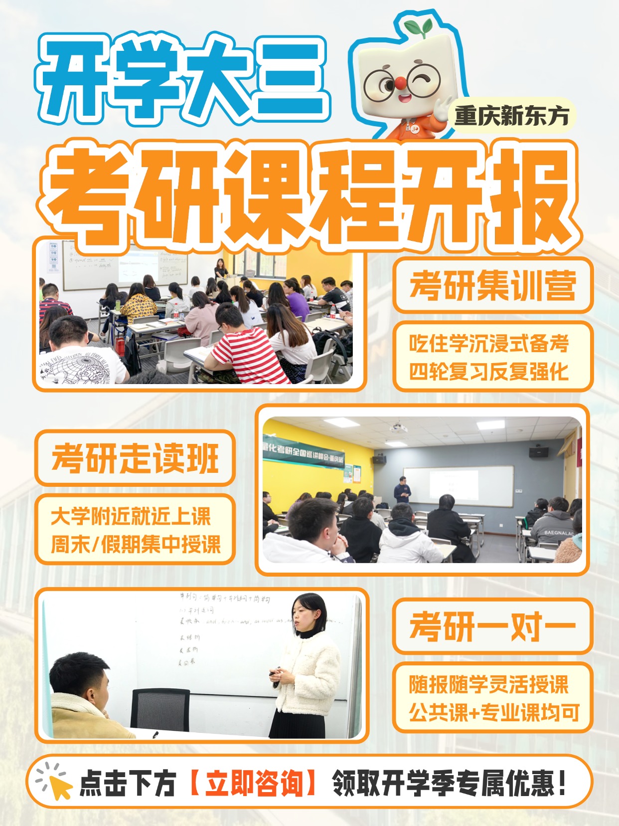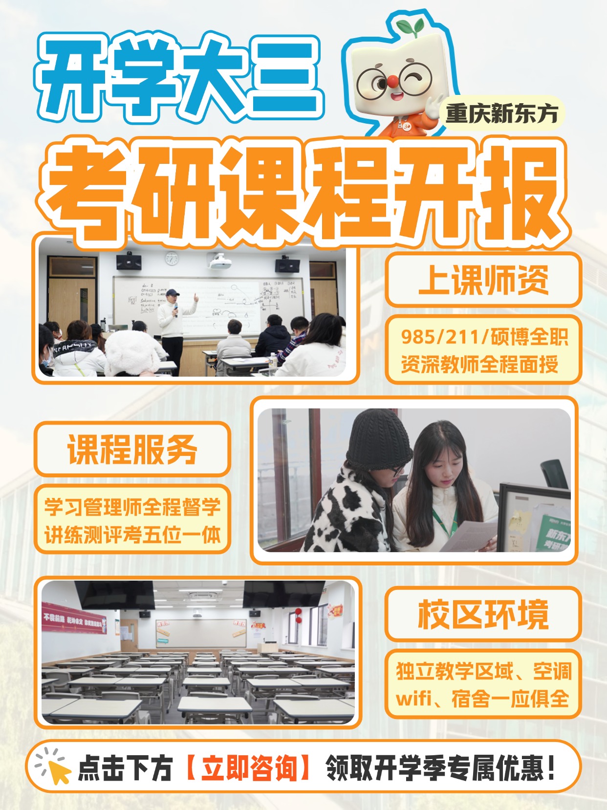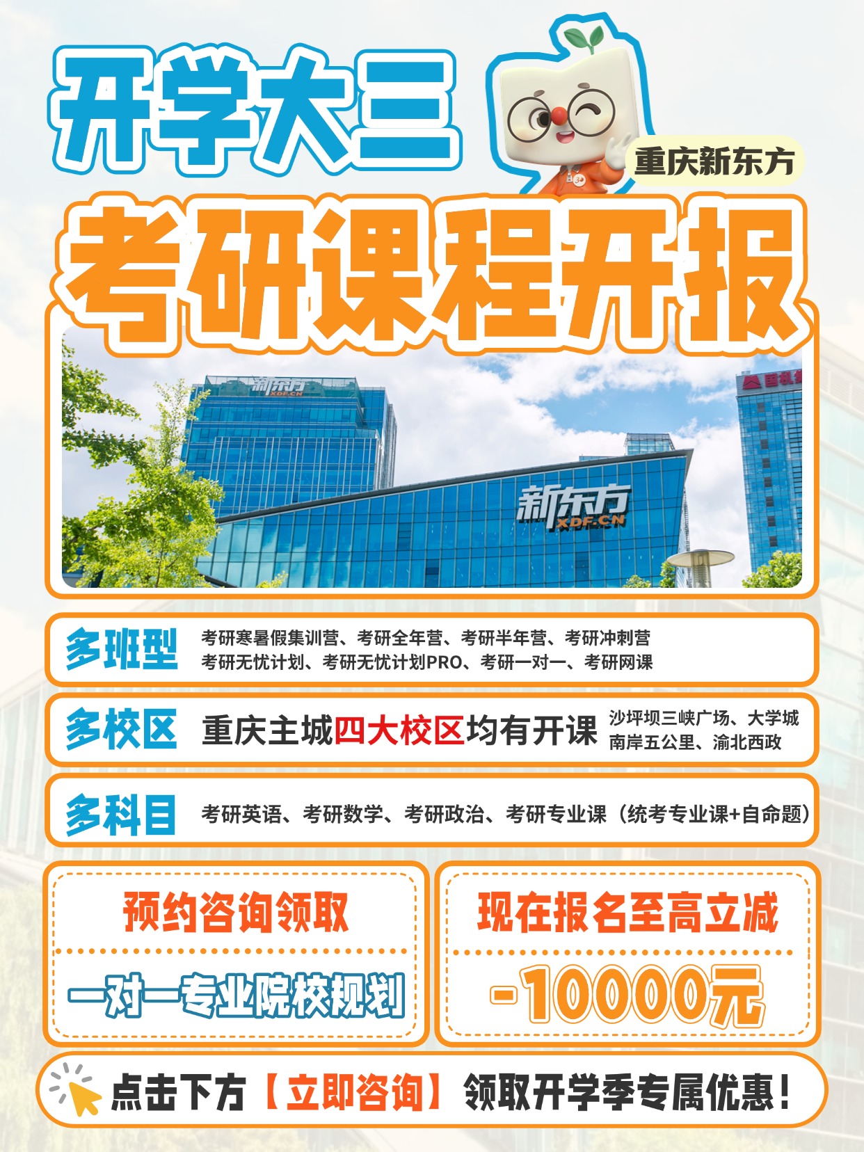 进入大三下学期,考研复习正式提上日程,但很多同学却陷入迷茫:目标院校怎么选?专业课如何准备?复习时间怎么安排?面对这些问题,一份专业、科学的个性化备考规划至关重要。重庆新东方为所有考生提供“咨询即送备考规划”的专属福利,帮助你迈出高效备考的第一步。