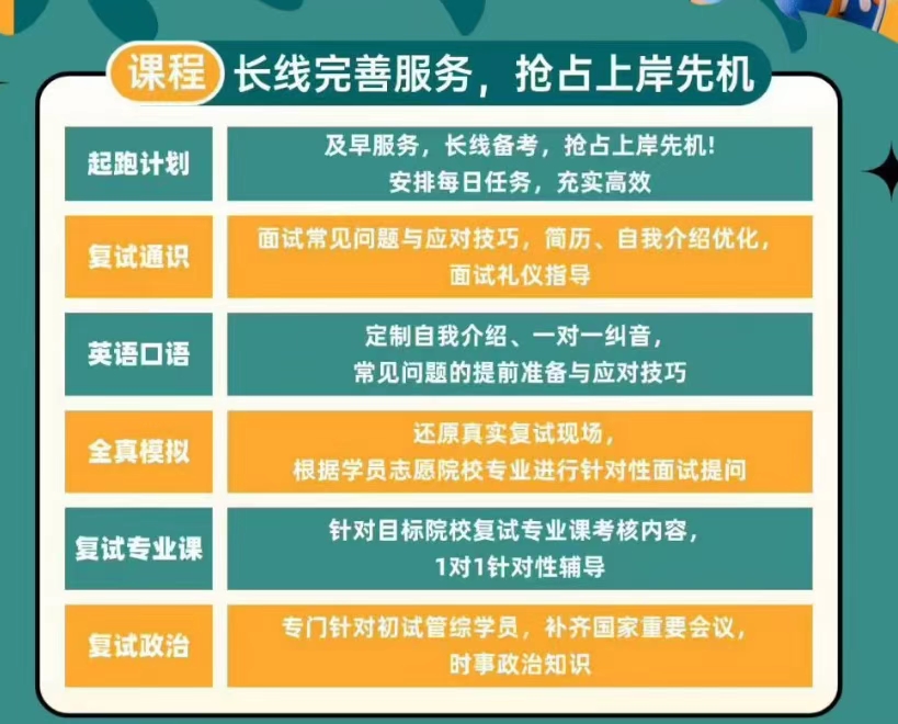 我们提供涵盖复试全环节的课程服务组合,从早期的“起跑计划”长线规划,到针对面试、英语、专业课、政治等各模块的精细辅导,直至高度还原考场的全真模拟,致力于帮助考生系统性地弥补短板,全面提升综合应试能力。