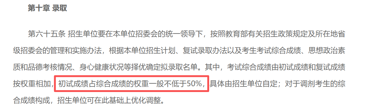 《2026年全国硕士研究生招生工作管理规定》指出:初试成绩占综合成绩的权重一般不低于50%。