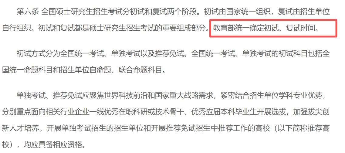 教育部在《2026年全国硕士研究生招生工作管理规定》中明确指出:教育部统一确定初试、复试时间。