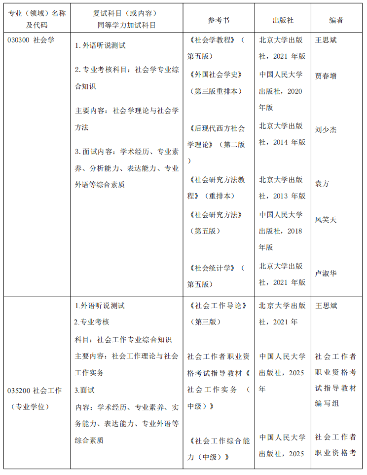 2026年社会学院硕士研究生招生考试复试专业科目详见下方: