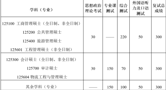 1.思想政治理论考试。工商管理、公共管理、旅游管理、工程管理(125601)、会计硕士、审计硕士、物流工程与管理硕士(125604)专业学位硕士的思想政治理论考试满分为30分(思想政治理论考试成绩≥12分为合格),成绩不合格者不予录取,考试成绩计入复试总成绩。采用线下复试形式的专业(全日制会计硕士、旅游管理硕士、物流工程与管理硕士),考试以笔试方式进行,试卷卷面分满分为60分(思想政治理论考试成绩=卷面成绩/2,计入复试总成绩);采用线上复试形式的专业,考试以随机抽题,面试小组提问,考生作答的方式进行。