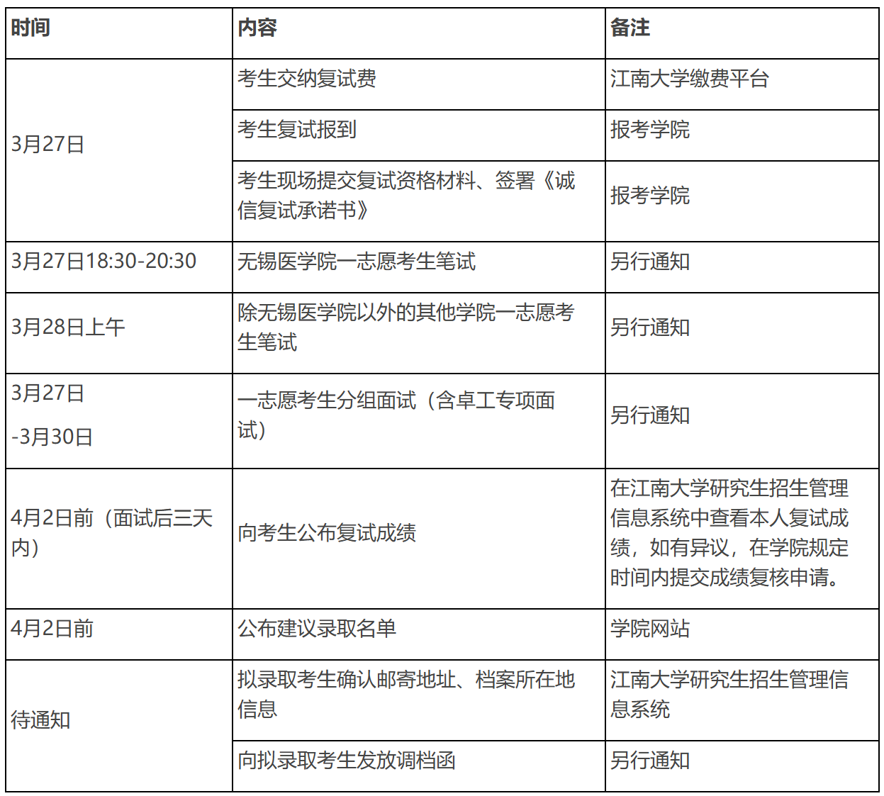复试包括专业课考核和综合面试。专业课考核内容为“江南大学2026年硕士研究生招生目录”中 公布的复试科目知识点,考核可以采取笔试、口试或实验技能测试等多种方式,具体形式以学院公布的细则为准;综合面试由专业素质考核和综合素质考核组成,成绩为各面试考官评分成绩的算术平均值。